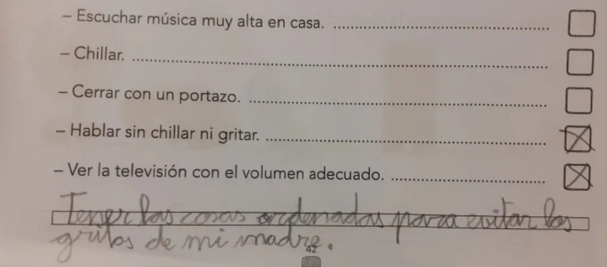 En la parte del ejercicio que al niño le correspondía agregar una opción que tuviera como fin evitar la contaminación sónica, el menor dio una viral contestación, escribiendo “tener las cosas ordenadas para que mamá no me grite”.
