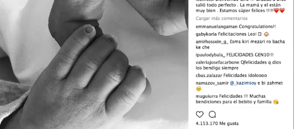 En su página oficial y su cuenta de Instagram el futbolista escribió: “¡Bienvenido Ciro! Gracias a Dios salió todo perfecto. La mamá y él están muy bien. ¡Estamos súper felices!”. El emotivo texto está acompañado por una conmovedora fotografía en blanco y negro, donde se puede observar la mano del recién nacido tomando suavemente uno de los dedos de su padre.