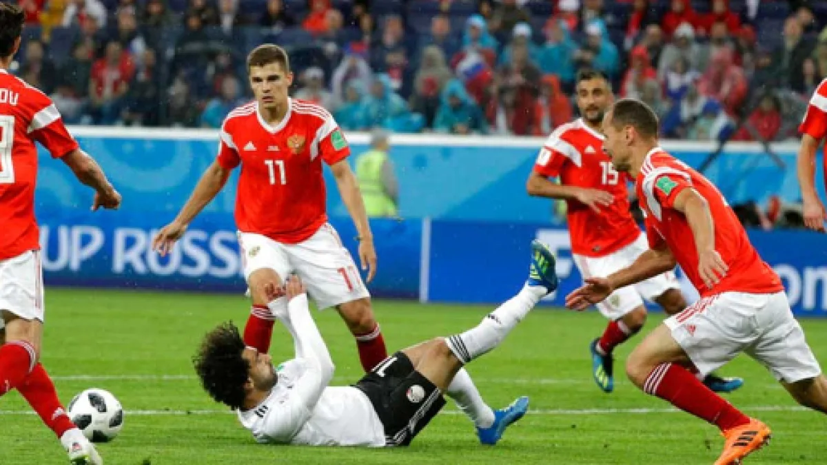 Egipto descontó a los 24 minutos, Salah fue derribado dentro del área, pero el juez al principio no marcó la falta dentro del área, por lo que después de consultar al árbitro de vídeo (VAR), marcó el penal.