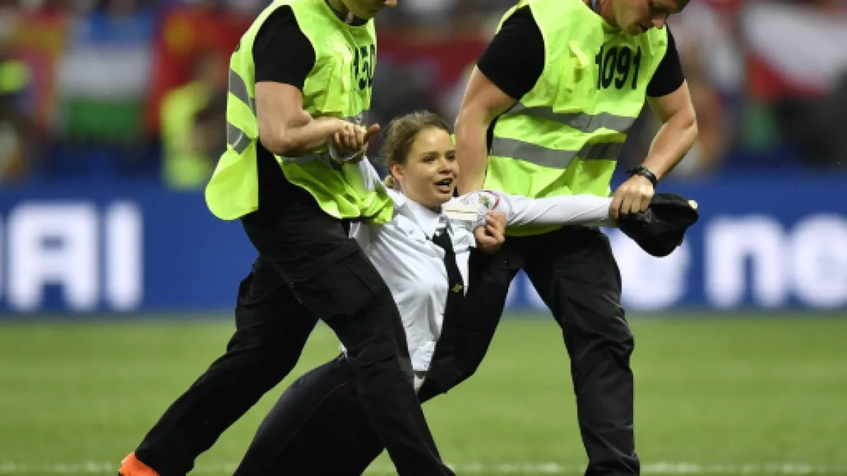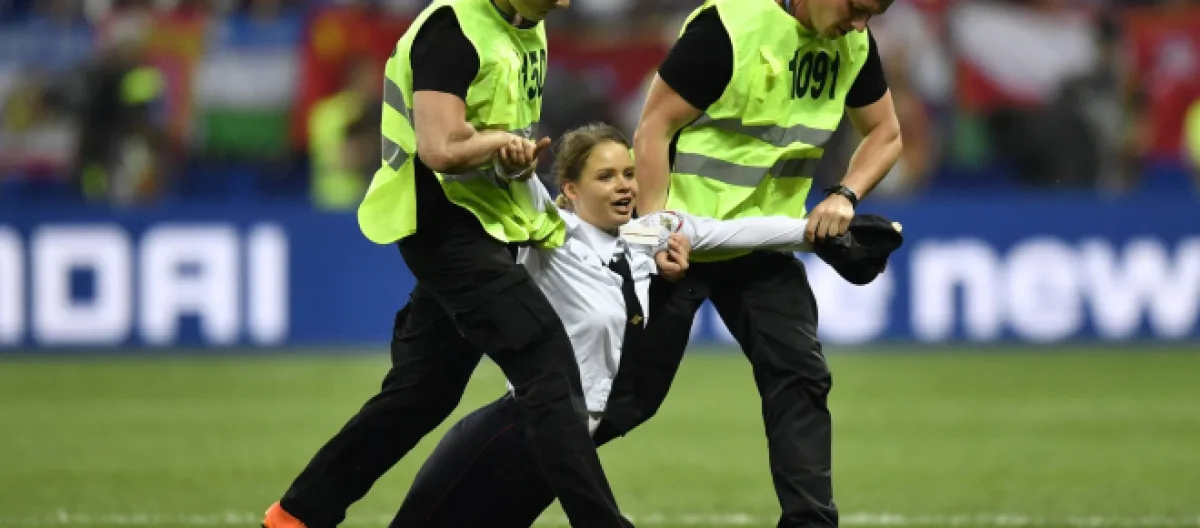 Con una vestimenta particular que hacía referencia a un policía ruso, algunos de los activistas llegaron a saludar a algunos jugadores franceses. Se informa que una cuarta persona trató de entrar, pero fue detenida. El conjunto de jóvenes corrió 50 metros, hasta que los guardias de seguridad entraron y los sacaron por medio de la fuerza. En ese instante se pudo presenciar un forcejeo entre uno de los hombre y el jugador croata Dejan Lovren, el cual mostraba su cara de enojo por la derrota y la interrupción.