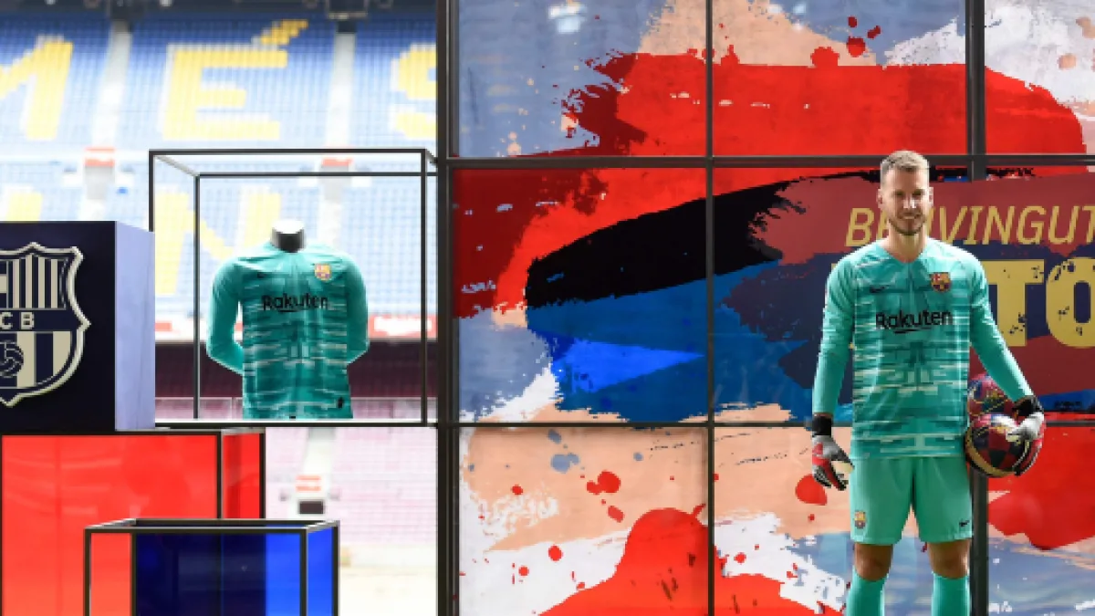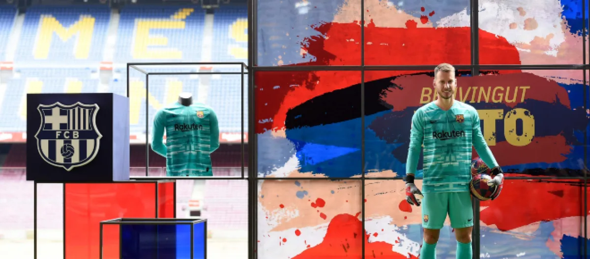 El portero, que hasta ahora jugaba en el Valencia, estampó su propia firma en el contrato junto a Josep María Bartomeu, presidente del F. C. Barcelona, ante los medios de comunicación, en un acto que se organizó en el palco del susodicho equipo azulgrana.
