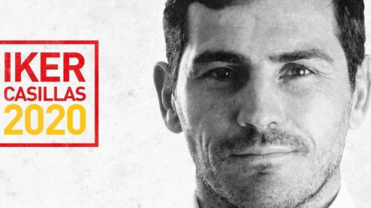 Acompañando al texto, aparece la imagen del cartel de su candidatura consistente en un primer plano del futbolista en blanco y negro junto al nombre de Iker Casillas y el año de las elecciones, 2020, impresos en los colores de la bandera española, rojo y amarillo