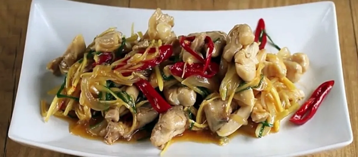 En un sartén que pueda contener todos los ingredientes, comenzamos colocando el aceite y una vez que esté lo suficientemente caliente, incorporamos las láminas de los ajos que, darán su perfume y su sabor a nuestro aceite. Agregamos los trozos de pollo, salteándolos ligeramente, pues se terminarán de cocinar a medida que vayamos incorporando el resto de los ingredientes; queremos que la carne del pollo se cocine bien pero, que no quede excesivamente seca. Incorporamos la juliana de cebolla, el pimiento de Cayena cortado en rodajitas y el jengibre en láminas.