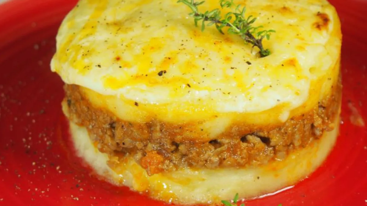 Luego en una olla con aceite caliente, agregar las cebollas, el ajo y ají. Se cocinan y cuando la cebolla esta cristalina se agrega la mezcla de los tomates licuados, la sal, pimienta y el tomillo. Cocinar por 15 minutos esta salsa. En un refractario se extiende una capa del puré, luego un poco de salsa, carne molida y el queso mozzarella.