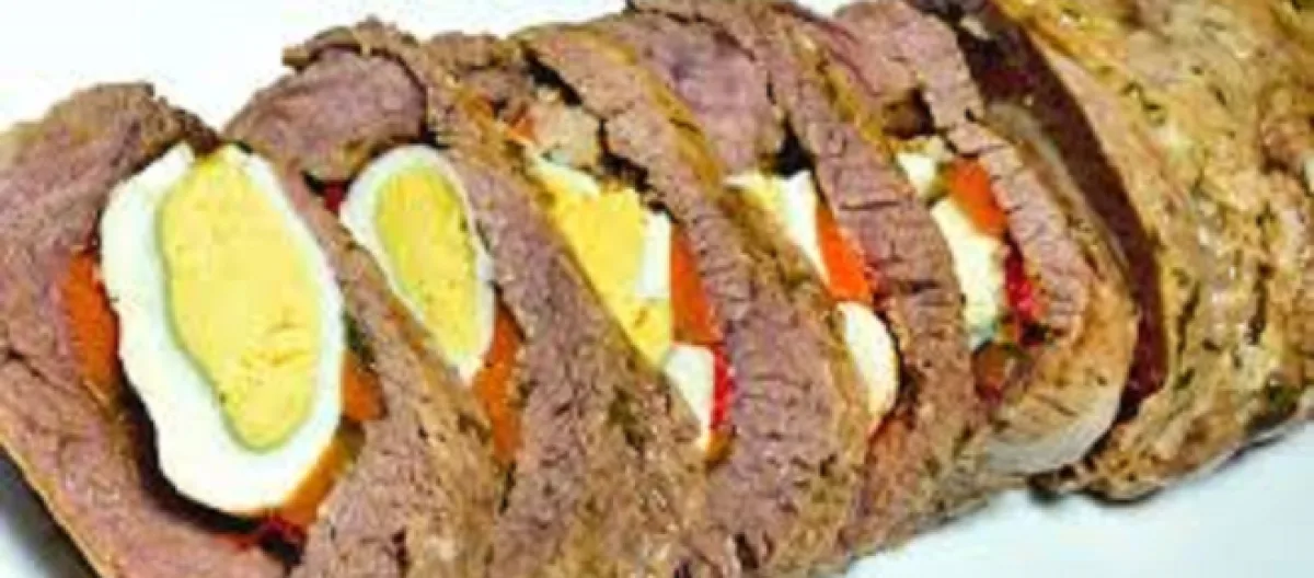 Se procede luego a rellenar, con la mitad de la preparación de las carnes, la especie de saco, cuando llevemos la mitad del relleno colocamos dentro los dos huevos duros uno a cada lado y terminamos de rellenar con el resto de la preparación.