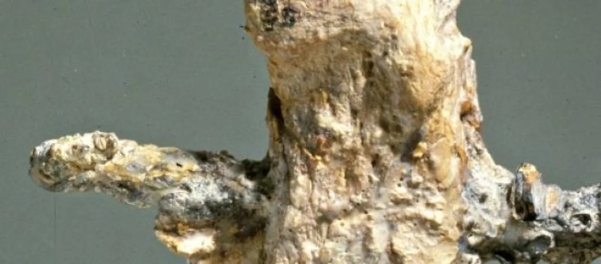 Entre los restos, destacaba los huesos de un talón derecho traspasados por un clavo de unos 12'5 cm, que se había conservado adherido porque no se pudo arrancar del cadáver, y una tabla colocada en la parte exterior del pie para evitar que se liberara.