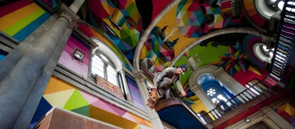 El artista Okuda San Miguel, ha llevado a cabo el proyecto artístico Kaos temple en la bautizada Iglesia Skate, situada en un pueblo en Llanera (Asturias) convertida en centro de peregrinación para los amantes del skate y la cultura urbana.