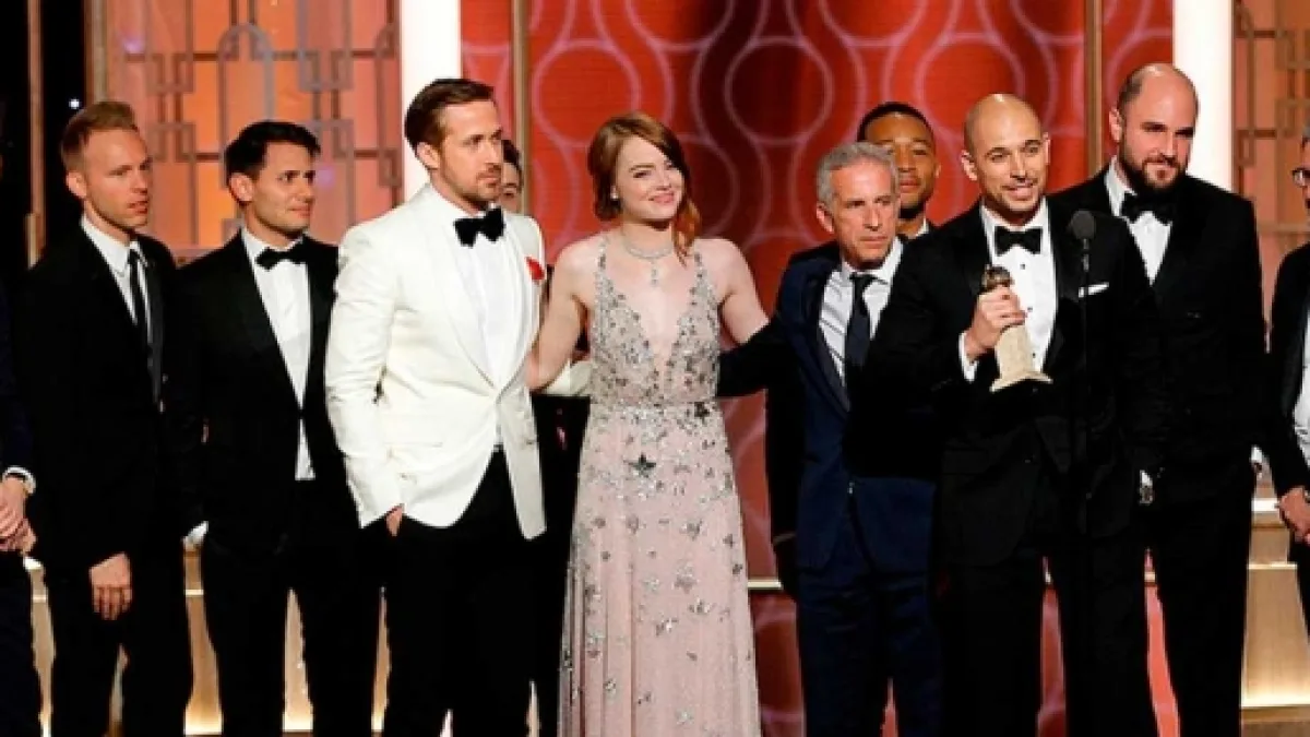 La La Land consiguió hacerse con los siete premios a los que estaba nominada, haciendo historia con un pleno, siete de siete. El musical recibió los galardones en las categorías de mejor director, mejor comedia, mejor guión, mejor banda sonora y mejor canción original. Por su parte, Ryan Gosling y Emma Stone, se llevaron el premio a mejor actor y mejor actriz, respectivamente, por sus brillantes interpretaciones. Stone se mostró emocionada al recibir el premio, puesto que, es el primer Globo de Oro que recibe en su carrera.