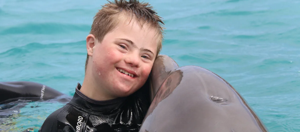 En este caso: la delfinoterapia consiste en que pacientes, principalmente niños con síndrome de Down o autismo, naden con delfines durante diez sesiones de quince minutos cada una. Su utilidad se debe a que estos mamíferos tienen el don de detectar áreas de discapacidad o problemas físicos en los humanos. Es decir, los delfines tienen un don tipo rayos X que les permite sentir en que parte de su cuerpo tienen trastornos. Logran hacer esto gracias a su sonar y por eso los científicos los llaman ecógrafos vivientes.