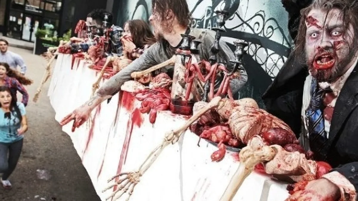 A través de una valla publicitaria que fue instalada en Londres, la cadena televisiva AMC nos ha traído a la vida a los espantosos zombies de la popular serie The Walking Dead. En esta valla los muertos aterrorizan a los caminantes que se acercan y al mismo tiempo se dan un banquete de carne humana y vísceras.